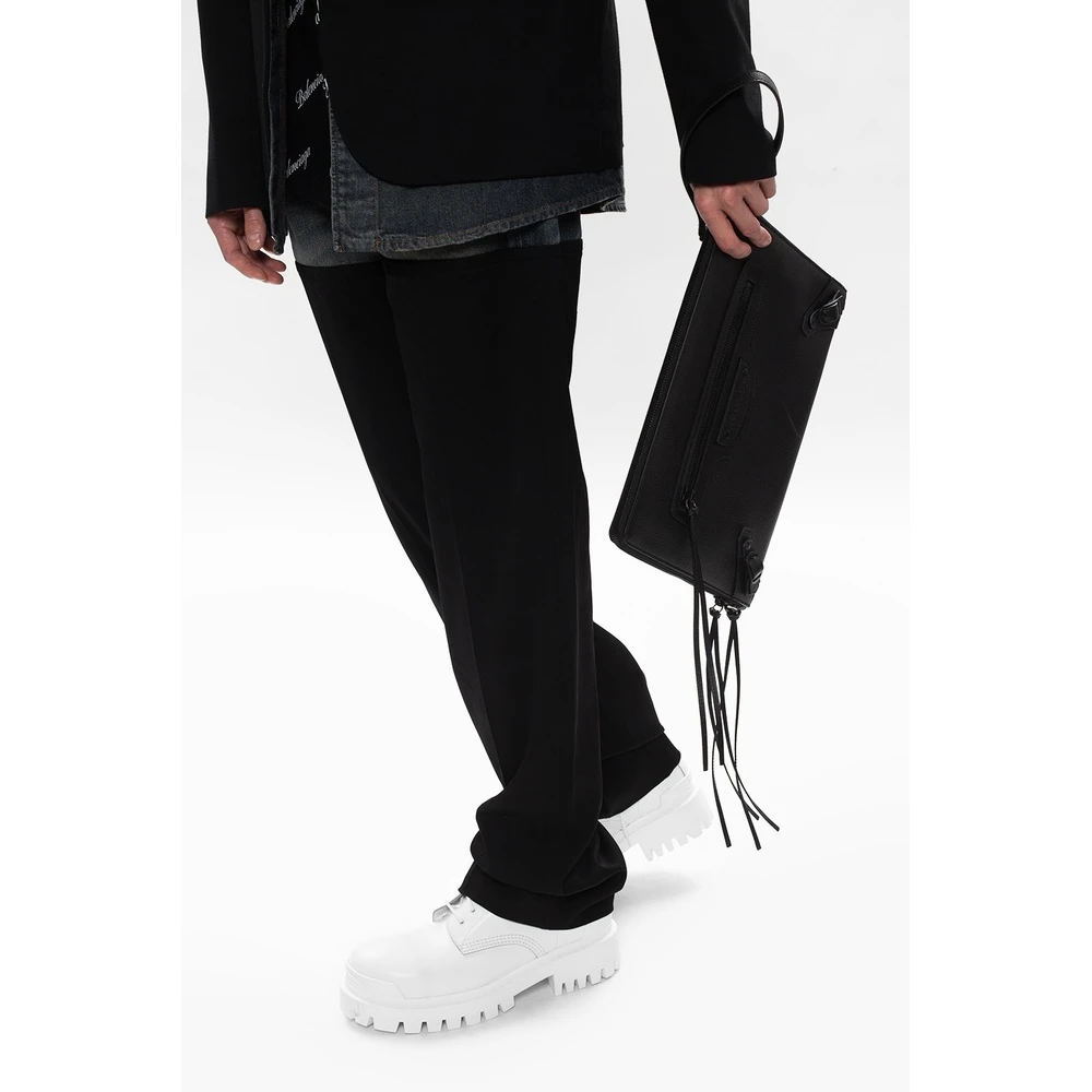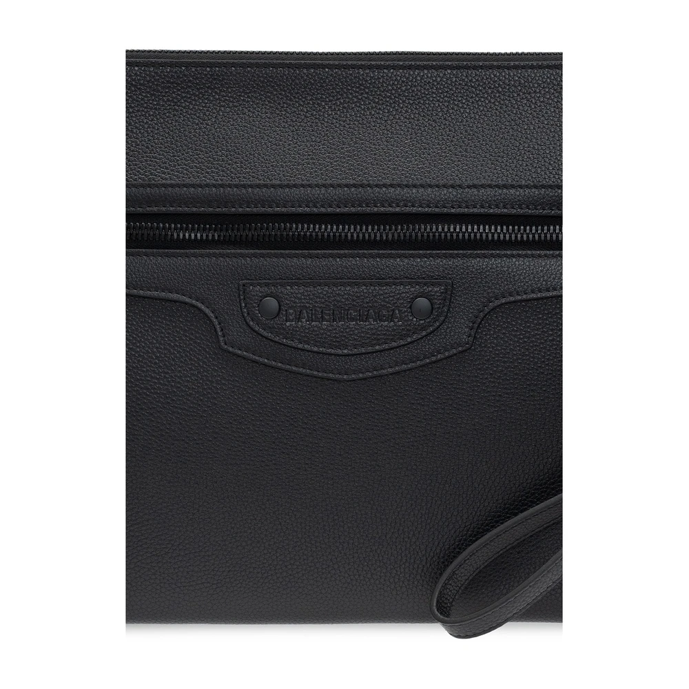 Svart koffert fra Balenciaga. Dette designet er laget av teksturert skinn og har en toveis glidelÄs, preget logo, glidelÄs foran, to klemmer, flyttbar hÄndleddstropp og et indre rom med lomme med en sliplock.