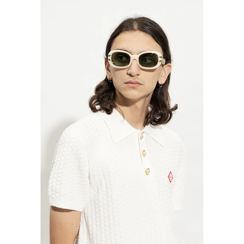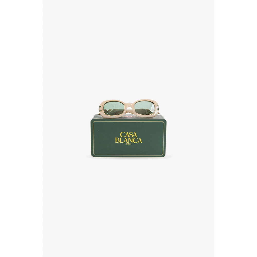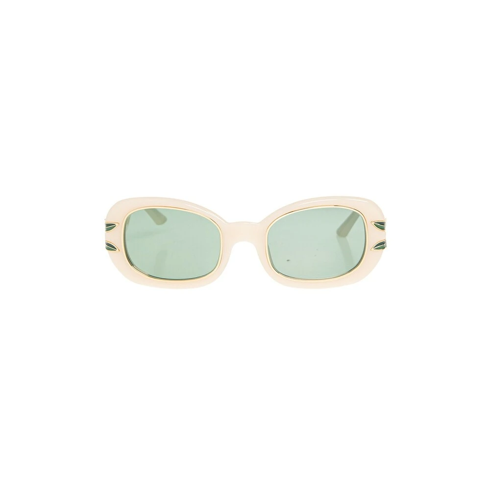 Krem solbriller fra Casablanca. Dette paret har ovale acetatrammer med gullfargede metallelementer, brede templer med dekorative merkevare hengsler, laurbærblad i rødt, grønt og gullfarge samt en grønn nylonlinser med UV-beskyttelse. Leveres med en sak.