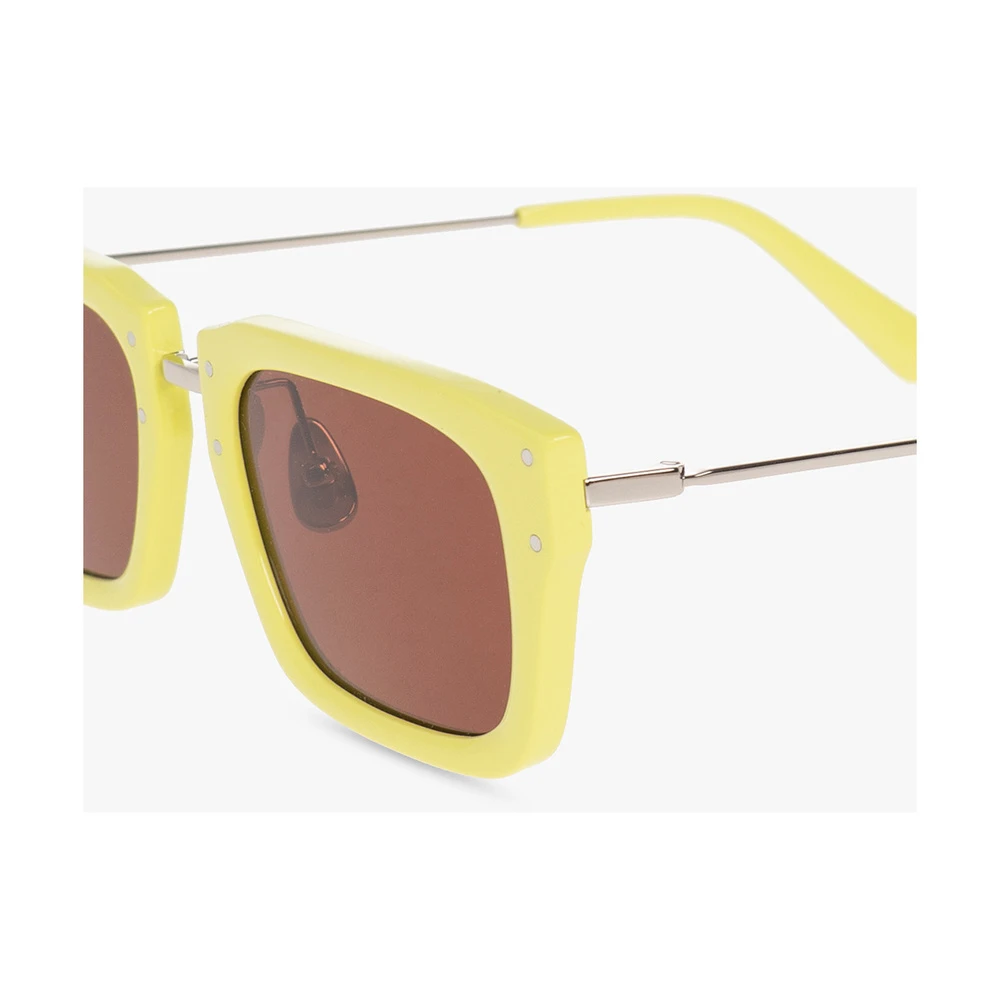 Gule og sølvfargede ‘soli’ solbriller fra Jacquemus. Denne D-Frame-modellen er laget av acetat og rustfritt stål, og inneholder logo som detaljerer om templene, og brune linser med 100% UV-beskyttelse. Saken inkludert.