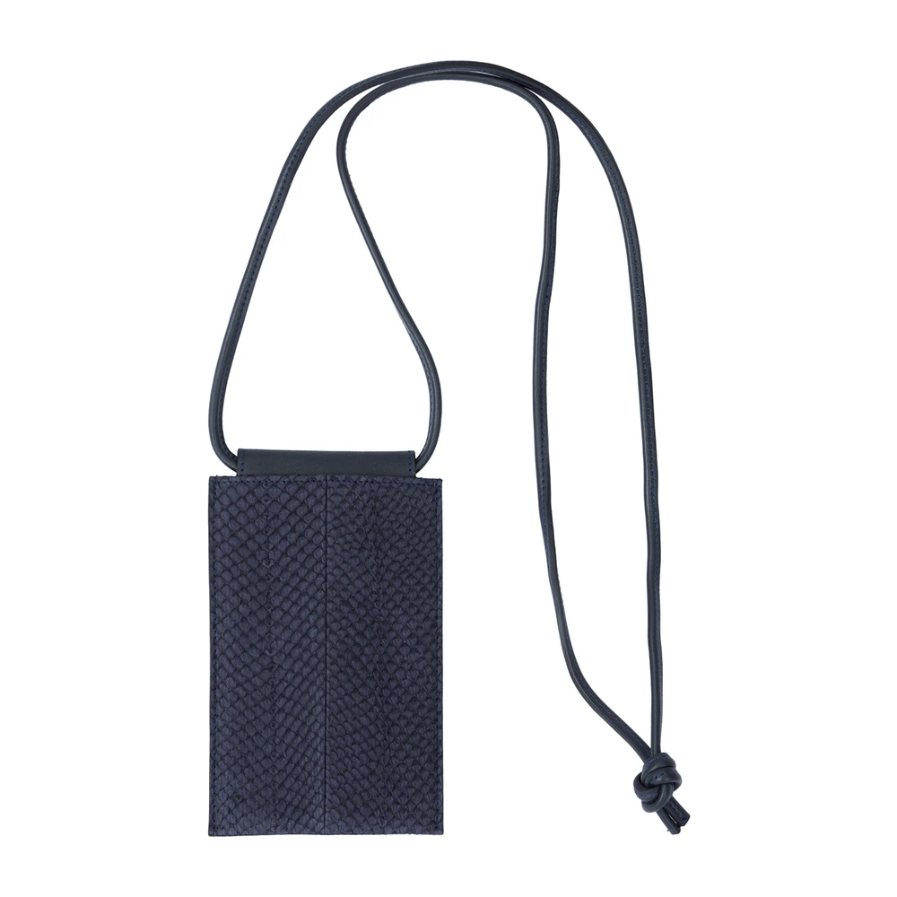 Telefon veske laget av nordisk lakseskinn i kombinasjon med ku skinn.