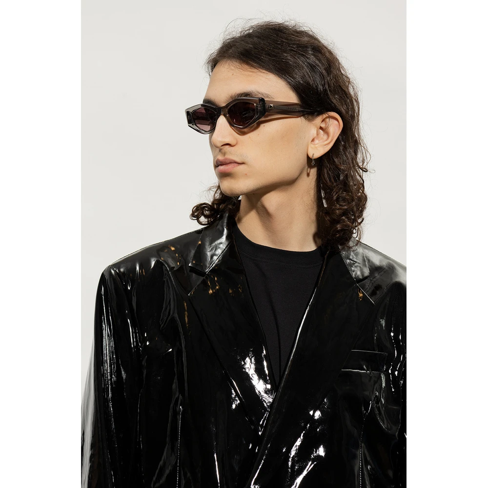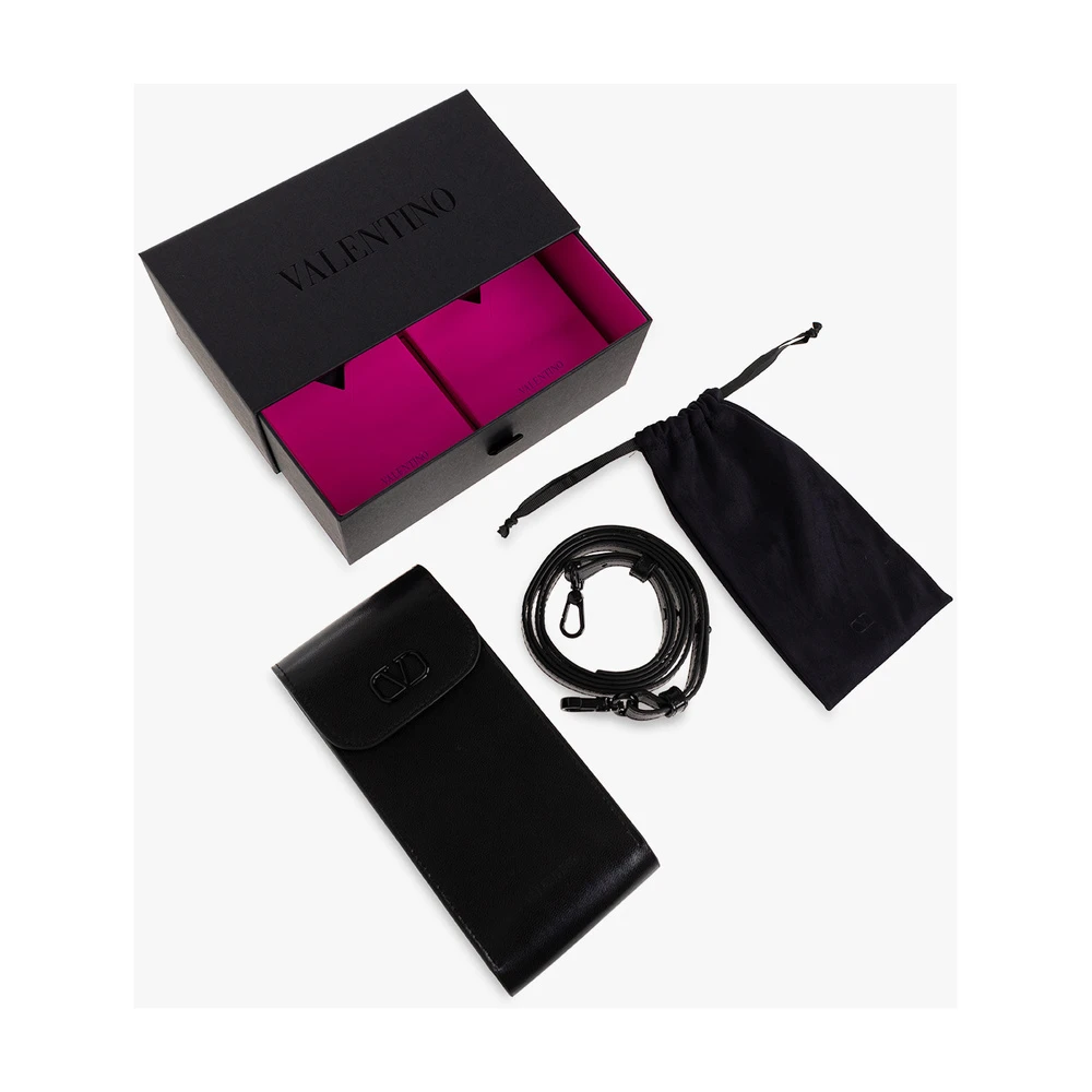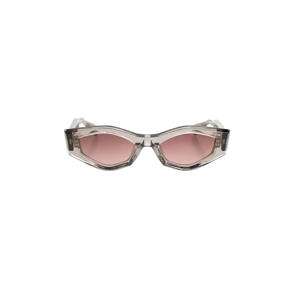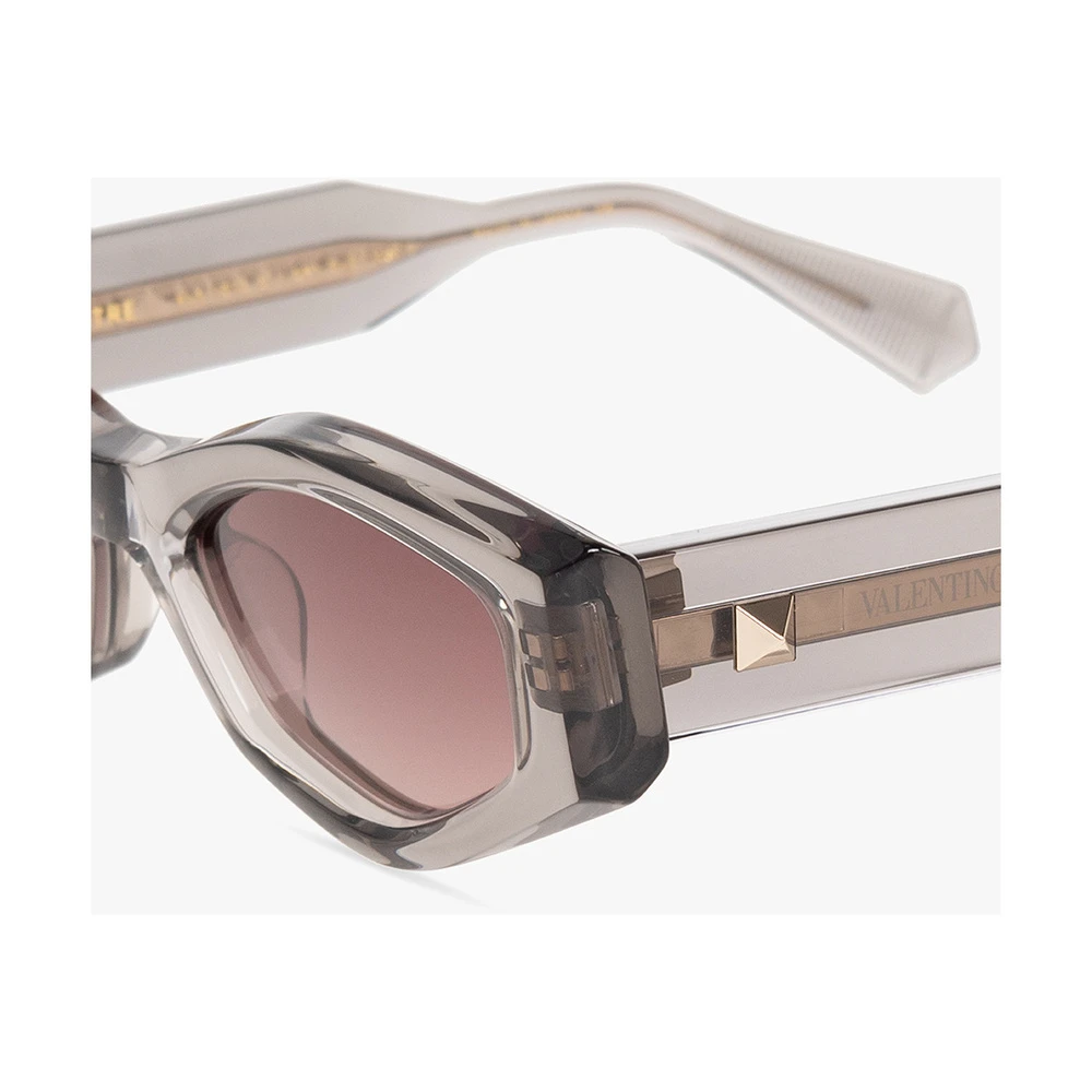 Grå, gjennomsiktige solbriller fra Valentino briller. Dette paret er laget av japansk acetat, og har sølvfarget titanelementer, geometriske rammer, templer med en logo og pigger, RFID-brikke på venstre bunntempel og mørk rosa gradientlinser med 100% UV-beskyttelse. Håndlaget i Japan. Leveres med en resirkulert lærveske med stropp og rengjøringsklut.